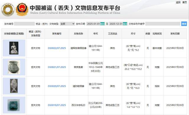 根据中国被盗(丢失)文物信息发布平台信息,在贵州省博物馆(老馆)被盗、丢失的29件套文物中,不少文物早在几年前或几十年前就被盗或丢失,但都集中于2025年公开发布。