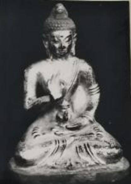 一座收藏在贵州省博物馆(老馆)的清代弥勒铜像,于2012年丢失。佛像高16厘米,背后设镂空火焰纹背光,整体造像比例匀称。虽然铜像有些残缺,但佛像头部浑圆,面部神态祥和,身披通肩袈裟,其衣褶线条流畅自然。
